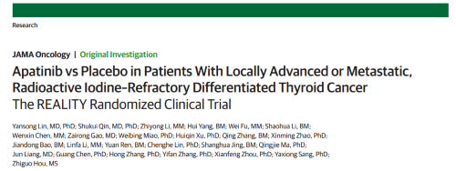 2021年12月16日,权威医学杂志《JAMA Oncology》(影响因子31.777)在线发表阿帕替尼的一项III期临床研究(REALITY)——甲磺酸阿帕替尼片治疗局部进展/转移性放射性碘难治性分化型甲状腺癌(RAIR-DTC)患者的多中心、随机、双盲、安慰剂对照临床研究。此研究由北京协和医院的林岩松教授和南京金陵医院的秦叔逵教授发起,在全国21个研究中心展开,由开云体育医药中央医学事务部团队支持完成。
