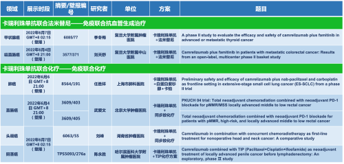 卡瑞利珠单抗联合开云体育医药的另一款创新药法米替尼在甲状腺癌和结直肠癌领域有2项研究被接收为壁报,另有卡瑞利珠单抗联合化疗的4项研究在肺癌、结直肠癌、头颈癌和阴茎癌领域的研究被接收为5份壁报。