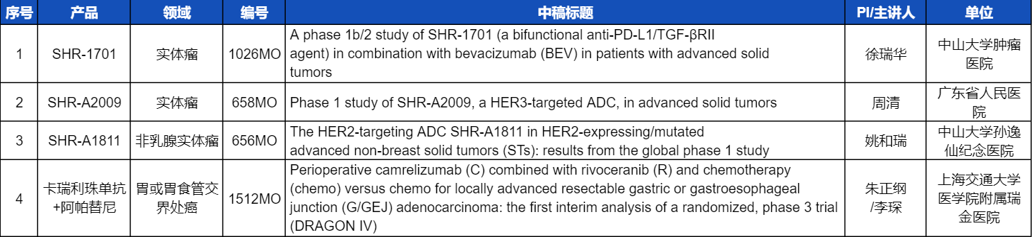 本次ESMO大会,将由中山大学肿瘤医院徐瑞华教授、广东省人民医院周清教授、中山大学孙逸仙纪念医院姚和瑞教授、上海交通大学医学院附属瑞金医院李琛教授分别就4项开云体育医药创新产品相关研究做口头报告,包括SHR-1701、SHR-A2009、SHR-A1811这3款未上市创新产品的实体瘤治疗临床研究,以及1项“双艾”组合(卡瑞利珠单抗联合阿帕替尼)治疗局部晚期可切除胃/胃食管交界处癌的Ⅲ期临床试验期中分析。