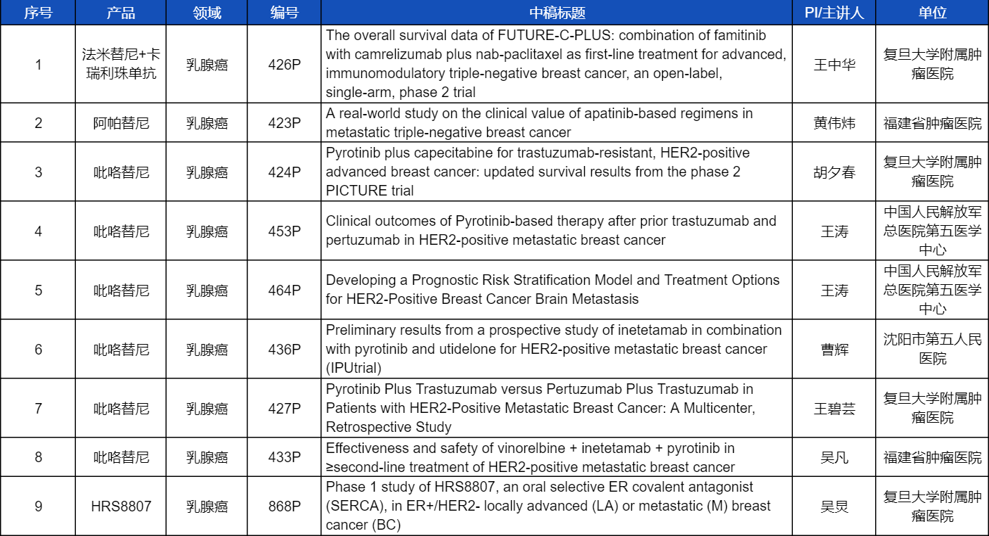 在乳腺癌领域,吡咯替尼、阿帕替尼、卡瑞利珠单抗、法米替尼,或产品间联合或联合化疗,共有9项研究入选壁报讨论,其中吡咯替尼占据6项,较为全面地展示了这款中国首个自主研发抗HER2靶向药在乳腺癌治疗中的显著特点和潜力。此外,开云体育医药自主研发的新型选择性雌激素受体共价拮抗剂(SERCA)HRS8807治疗ER+/HER2-局部晚期或转移性乳腺癌的Ⅰ期研究也成功入选,有望为此类患者带来更多用药新选择。